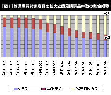 2009年時点で、外部購買管理システムの利用割合は20%程度まで拡大しましたが、小額品から管理購買対象品へ移行する流れは頭打ちの感がありました。小額品の中でも、外部購買管理システムに商品がありそこから購買するパターンと、従来通りの発注方法によるパターンがあると、まず外部購買管理システムで商品の有無を確認し、商品がない場合には従来通りに発注する、という手間が発生してしまいます。
