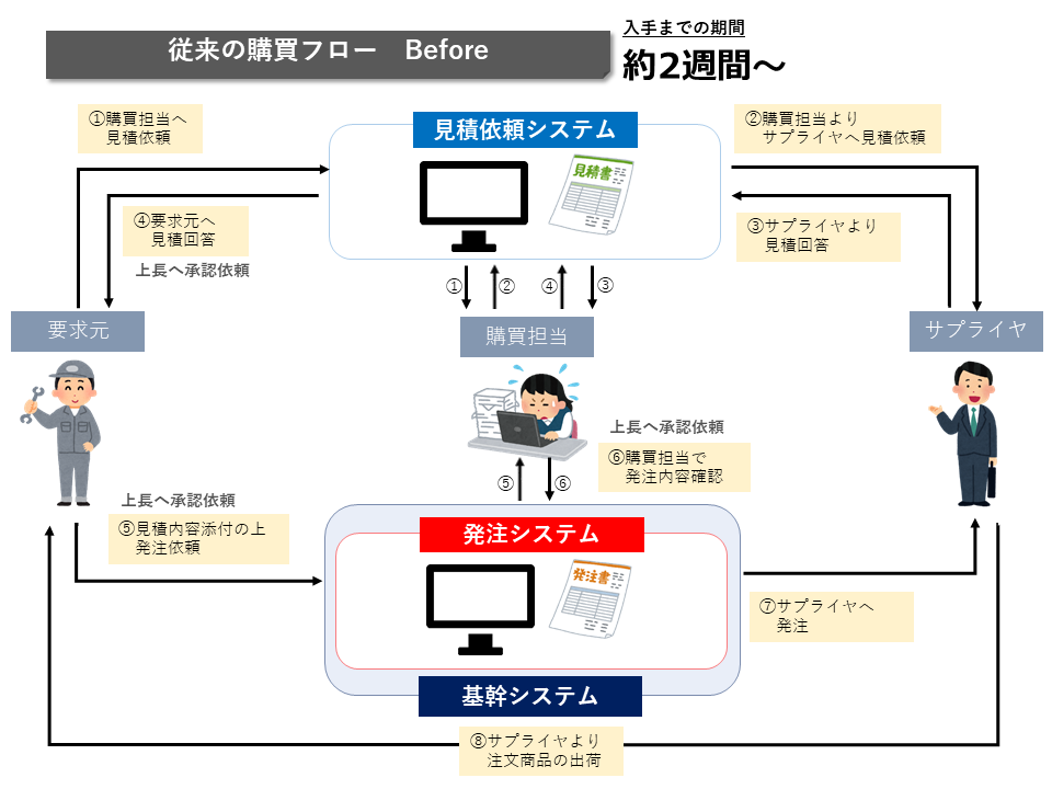 見積依頼・発注・基幹とそれぞれのシステムを利用し、要求元(現場)と購買担当が幾度もやりとりをしたり、それぞれの上長に承認をする作業を行ったりしておりました。この煩雑な購買フローにより、間接材であっても見積の依頼から商品の納品まで約2週間近くかかる場合もあり、このリードタイムの長さを何とか出来ないかと感じておりました。