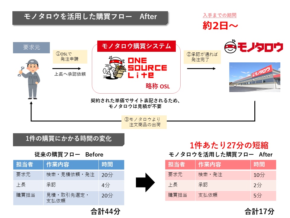 要求元から調達部門購買担当への見積依頼にかかる時間、購買担当がサプライヤへの相見積にかかる時間、見積結果を要求元へ返却する時間、注文商品を決定する前段階で膨大な時間と手間がかかっておりました。見積という業務そのものをOSLからのカタログ購買に置き換えてゼロにすることで、1件の購買にかかる時間の大幅削減を実現できました。具体的には、従来の購買フローでは合計44分かかっていたところ、OSLでの購買フローでは合計17分と1件あたり27分の時間短縮に成功し、約2週間のリードタイムを2~3日にまで減らすことができました。