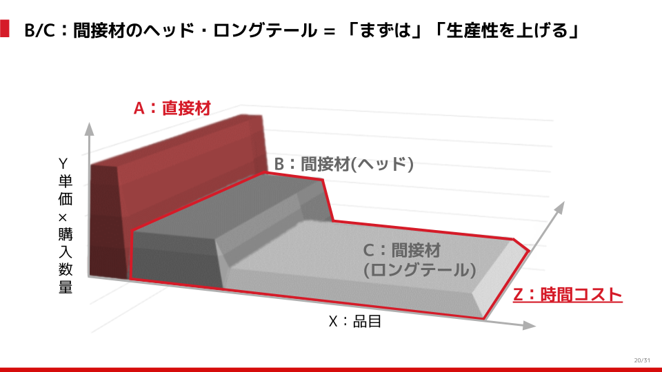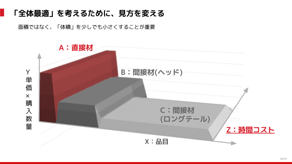 ただし、B・Cの領域においても、Aと同様に時間をかけて縦軸をできるだけ小さくしようというアプローチをするのが正解なのでしょうか。例えば、100円のボールペンの値段を下げるためにAの直接材と同様に価格交渉をするのは、やや非効率、部分最適のように見えてきます。