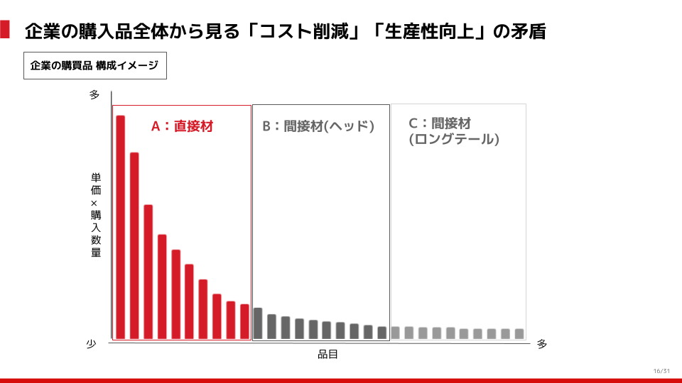 一方、B・Cの領域=間接材については、品目が多く金額も安いというのが特徴で、実はコスト削減余地が多く残されている領域でもあります。