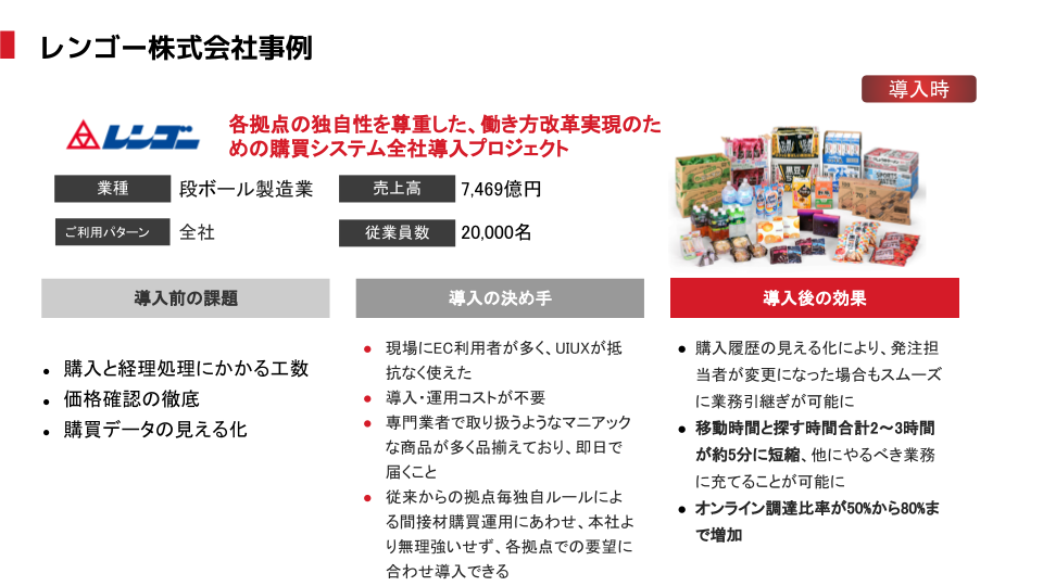 総合包装材メーカーであるレンゴー株式会社様においては、もともと間接資材購買においては本社稟議が必要な金額を超えない限り各工場や子会社がそれぞれのプロセスで発注を進めていました。