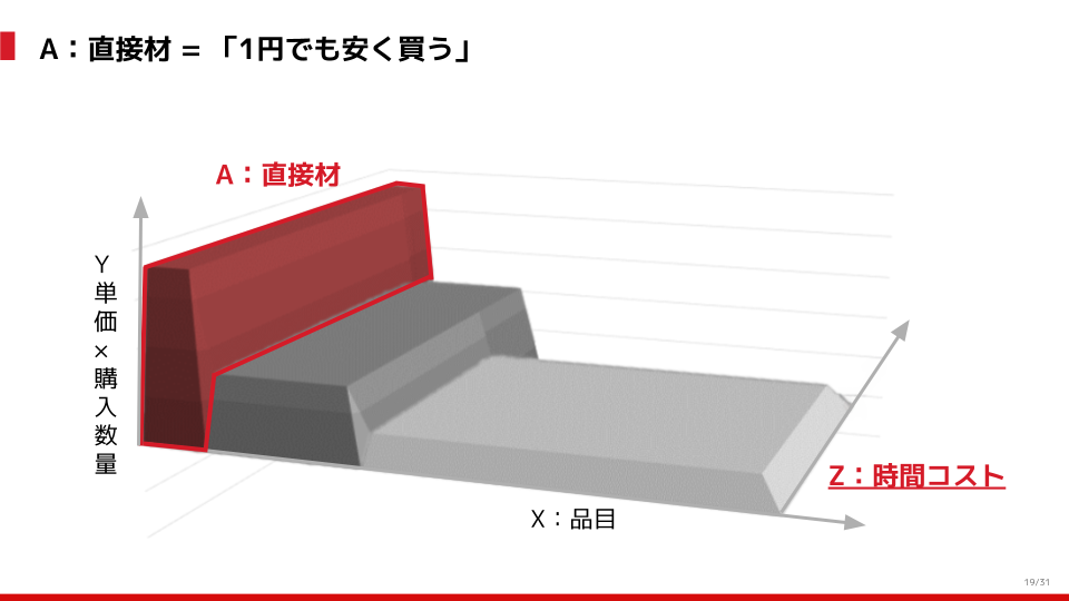 まず初めに、Aの領域=直接材については、「1円でも安く買う」すなわちY軸を少しでも減らすことが正解です。