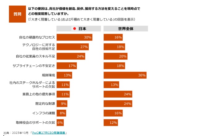 また、生産性における課題を調査したPwCコンサルティング合同会社の調査では、自社の改革を阻む要因について、日本国内では、「自社の硬直的なプロセス」「テクノロジーに対する自社の技術不足」や「自社の従業員のスキル不足」との回答が、最上位となっています(「PwC第27回CEO意識調査」, 2023年10月)。この中で取り組むとしたら、プロセスを改革していくことが、決まった業務の効率的な実行において、効果的であると考えられます。