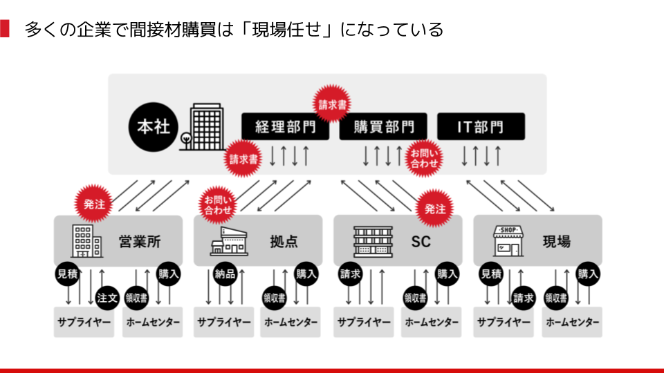 よくあるケースでは、各拠点でホームセンターや商店に行って立替精算で購入したり、地場の商社とそれぞれがやり取りをしたり、個人でECに登録して会社のクレジットカードで購入したり、と、それぞれの拠点や社員が様々な方法で購買をしています。