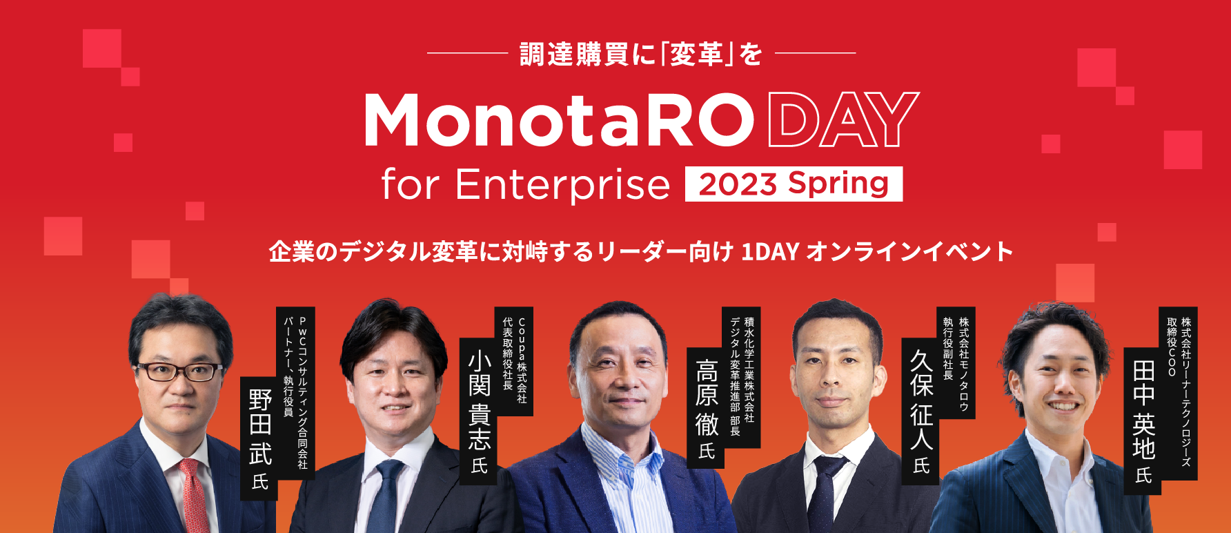 モノタロウ大企業向けサービス主催のオンラインカンファレンス「MonotaRO Day forEnterprise」が、2023年5月25日に開催されました(アーカイブ配信を6/1-8/31に実施)このイベントでは、調達・購買プロジェクトを最前線でリードしている有識者の声を通して、調達・購買デジタルシフトに本格的な着手ができていない企業様、社内浸透にお悩みの企業様へ向けて導入・活用事例やノウハウをコンテンツとしてお届けしました。