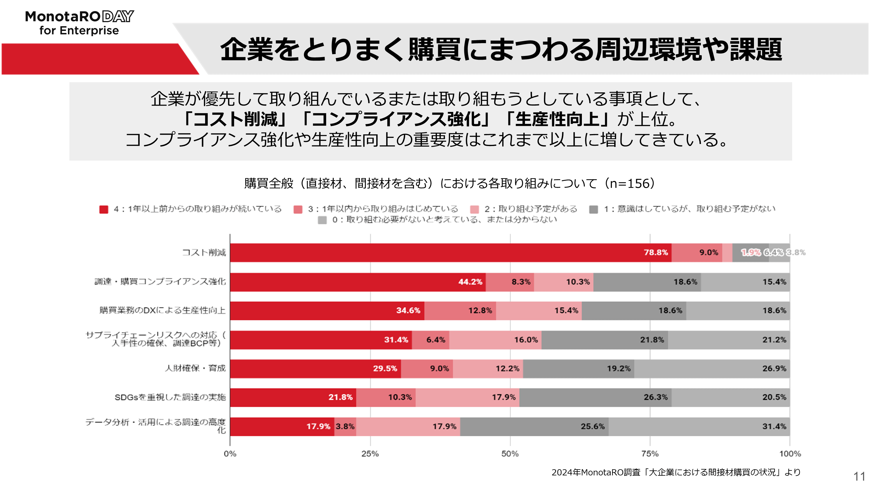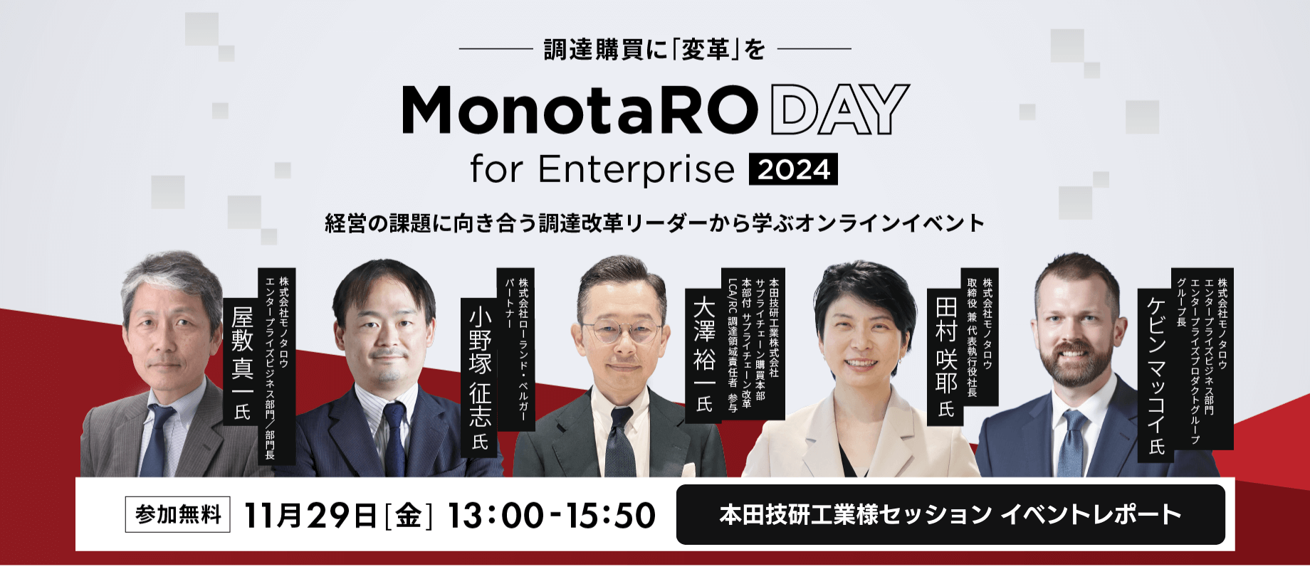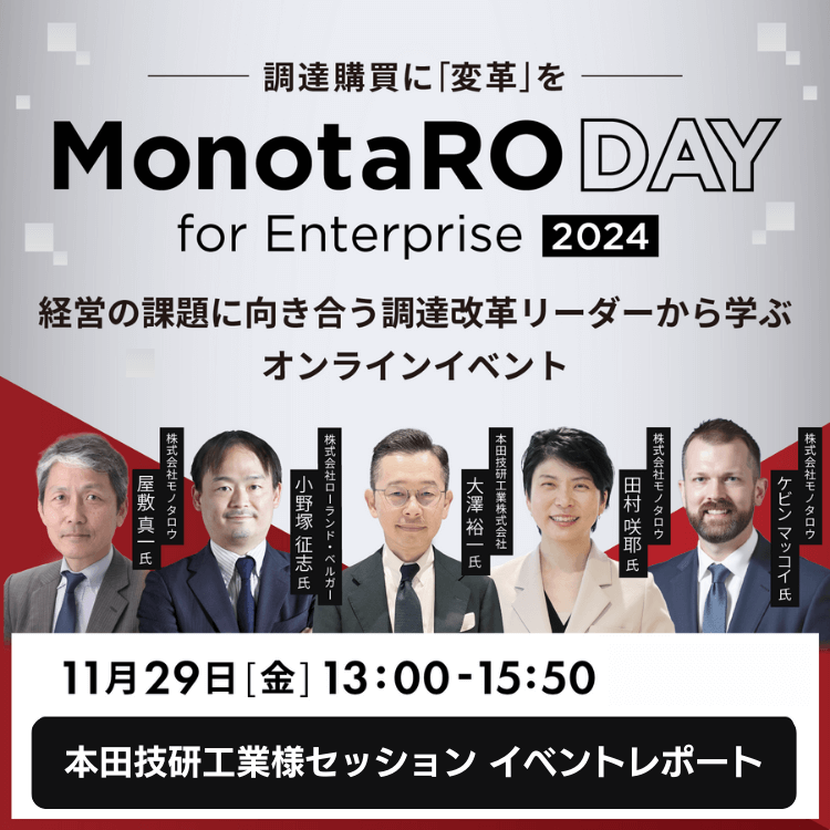 モノタロウ大企業向けサービス主催のオンラインカンファレンス「MonotaRO Day for Enterprise」が2024年11月29日に開催されました。当日は調達購買・サプライチェーンの最先端についての複数セッションが展開され、企業のさまざまな業種・部門からご興味をいただき、多くの皆様にご視聴いただきました。