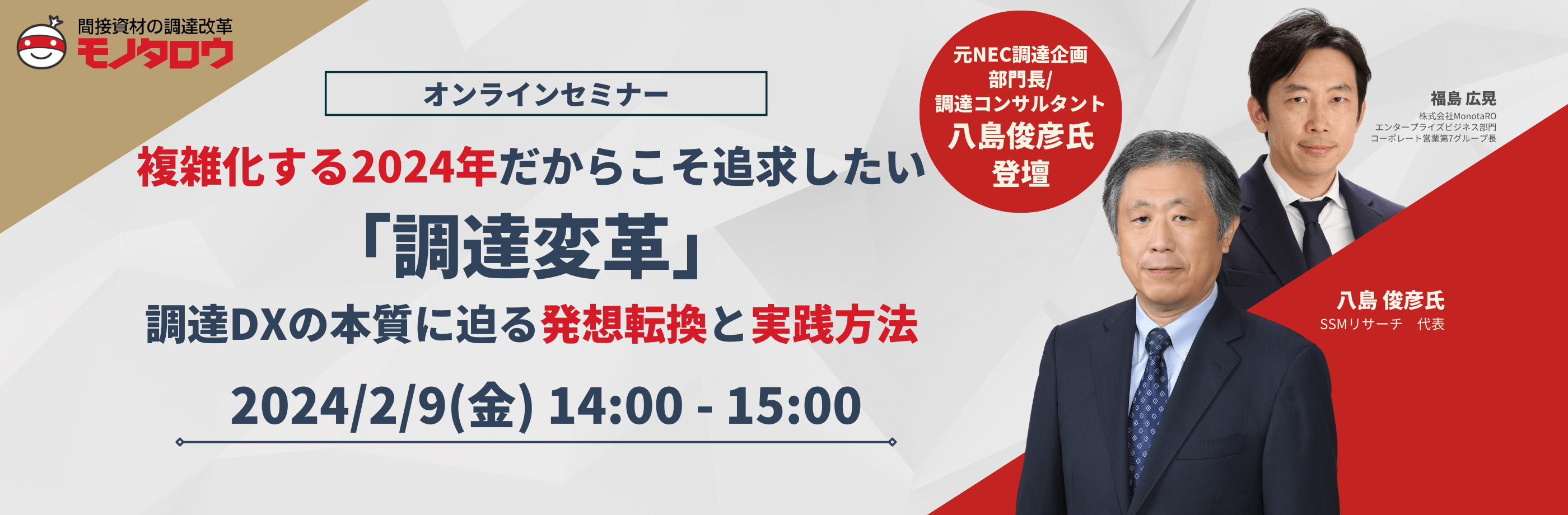本セミナーでは、元NEC調達企画部門長・国内外で30年以上調達関連のご活躍をされているコンサルタント・八島俊彦氏をお迎えし、大手企業の資材調達において2024年に着目すべき重要課題と改革の取り組み方を伺います。