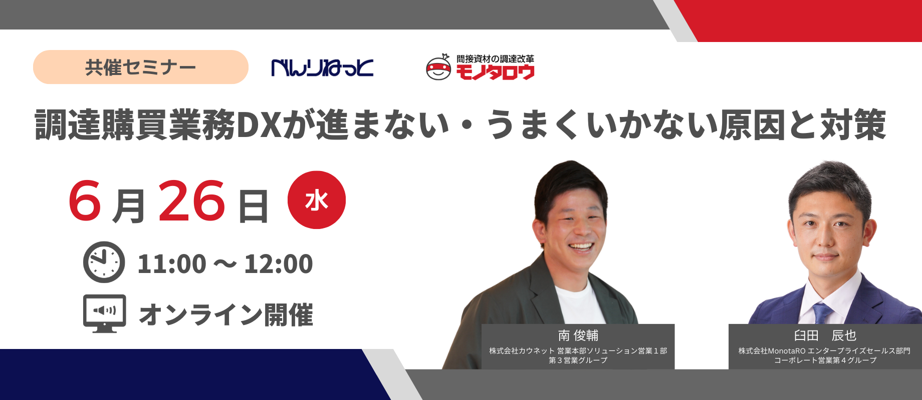 本セミナーでは、調達・購買領域におけるDX化推進を支援するカウネット・モノタロウ共催で、大企業の調達・購買業務にて直面する課題を明らかにし、実際にDXを推進するための実践的なステップと成功事例をご紹介します。