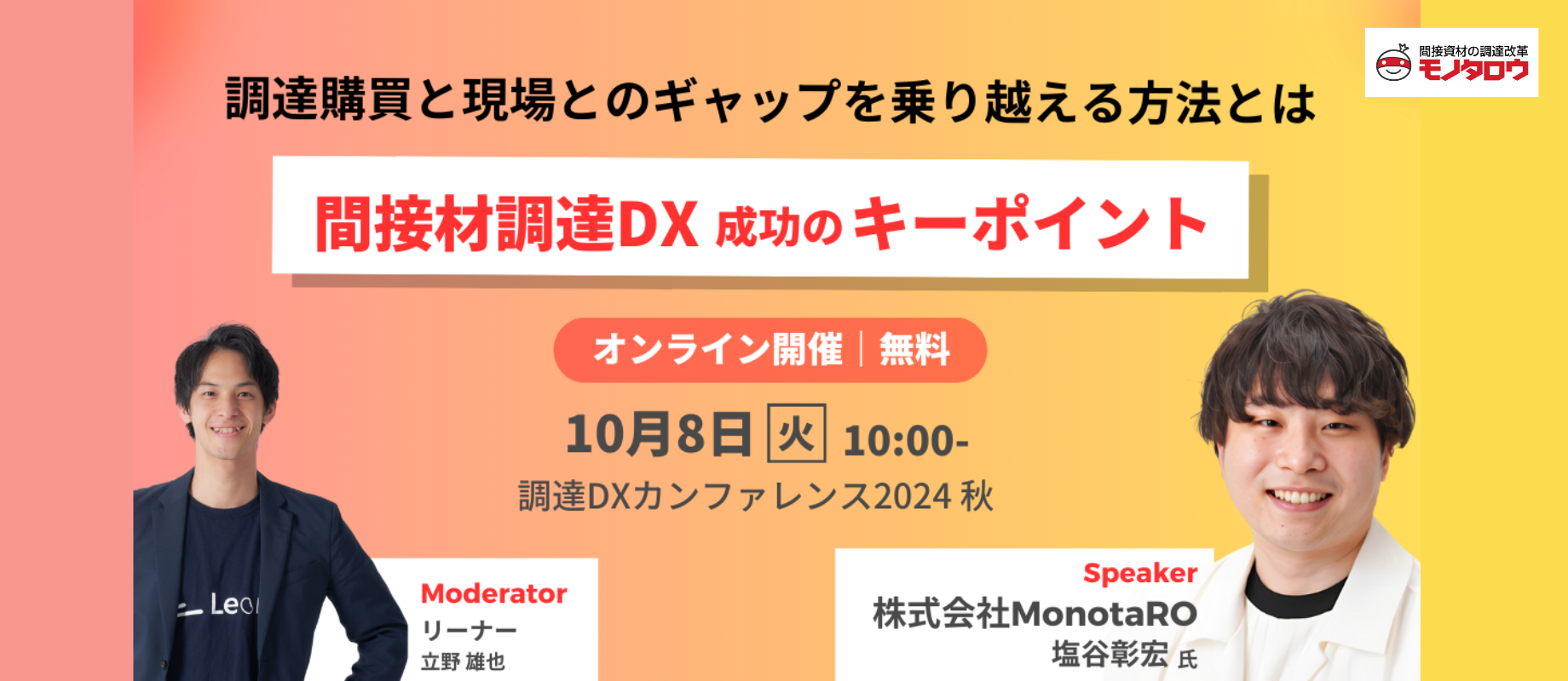 | 開催日時 | 2024年10月8日(火)10:00~(カンファレンス全体) モノタロウセッション 14:30~15:10 |