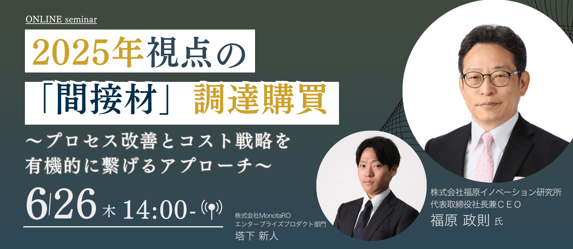 そこで本会では、調達改革コンサルティングとして大手製造業450社以上の支援実績を持つ、福原政則氏をお招きし「間接材」調達の課題解決に向けた具体的な方法論と実践事例をご紹介します。前半セッションでは、2025年視点で「間接材」の業務プロセス改善や、調達購買部門の至上ミッションであるコスト戦略の解説を行います。続く後半のセッションではより実践的な話題に焦点をあて、当社との対話形式で進行します。サプライヤーとの効果的な調達交渉術、自社能力を補完するアウトソーシング戦略、さらに製造業・小売業など業界別の成功事例を踏まえながら、企業価値向上に貢献する調達購買部門の未来像を探ります。