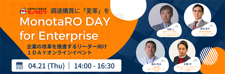 | 14:15 ~ 15:05 | 特別対談:「なぜ購買統制で経営課題が解決できるのか」 【スピーカー】 ■SAPジャパン株式会社 バイスプレジデント インテリジェントスペンド&ビジネスネットワーク事業本部長 牧野 仁様 ■株式会社MonotaRO エンタープライズビジネス部門 部門長 柴垣 香平 ■モデレータ 株式会社MonotaRO エンタープライズビジネス部門 エンタープライズビジネス統括グループ グループ長 屋敷 真一 |