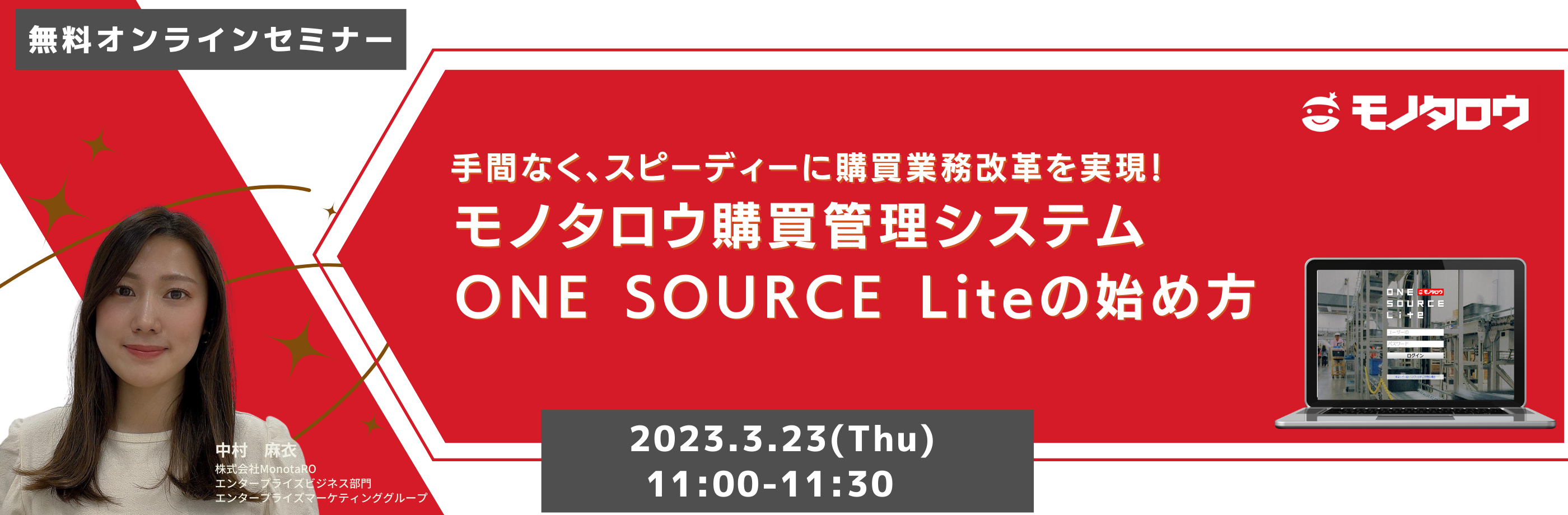 モノタロウの購買管理システム『ONE SOURCE Lite』を活用した、購買業務改革プロジェクトの進め方をご紹介するセミナーです。