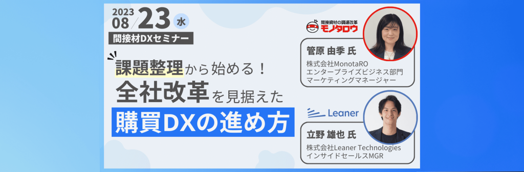 本セミナーは、LeanerTechnologiesとモノタロウが共催で、ロングテール品の購買活動におけるDXの進め方に焦点を当て、課題の整理から成功事例まで購買DXの重要性と進め方をお伝えする内容となっております。